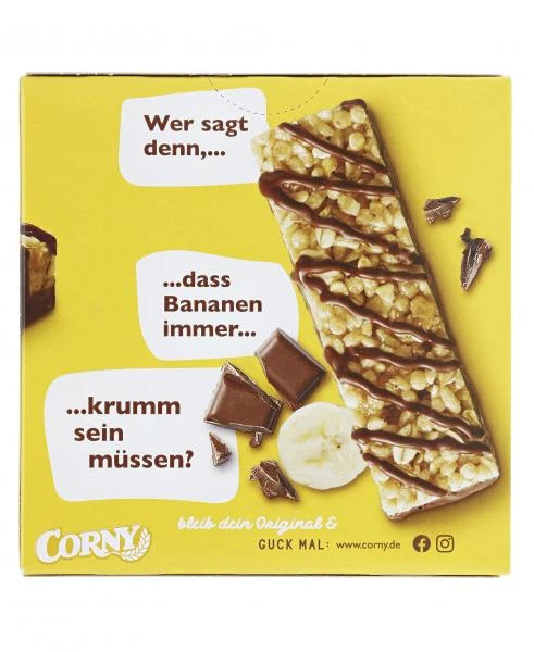 Banane und Schoko passen perfekt zusammen. Wer mag nicht auch schokoüberzogene Bananen vom Jahrmarkt oder ein Bananen-Split? Und auch als Riegel sind Schoko und Banane eine leckere Kombination. Deshalb zu Recht unter den Top 3 der beliebtesten Müsliriegel: der CORNY Schoko-Banane.