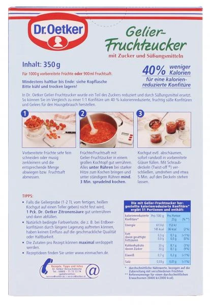 In Dr. Oetker Gelier-Fruchtzucker wurde ein Teil des Zuckers reduziert und durch Süßungsmittel ersetzt. So können Sie im Vergleich zu einer 1:1 Konfitüre um 40% kalorienreduzierte, fruchtig süße Konfitüren und Gelees für den Hausgebrauch herstellen.