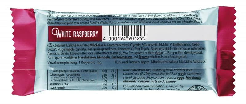 Ballaststoffreicher Riegel mit gefriergetrockneten Himbeeren und weißer Schokolade.
